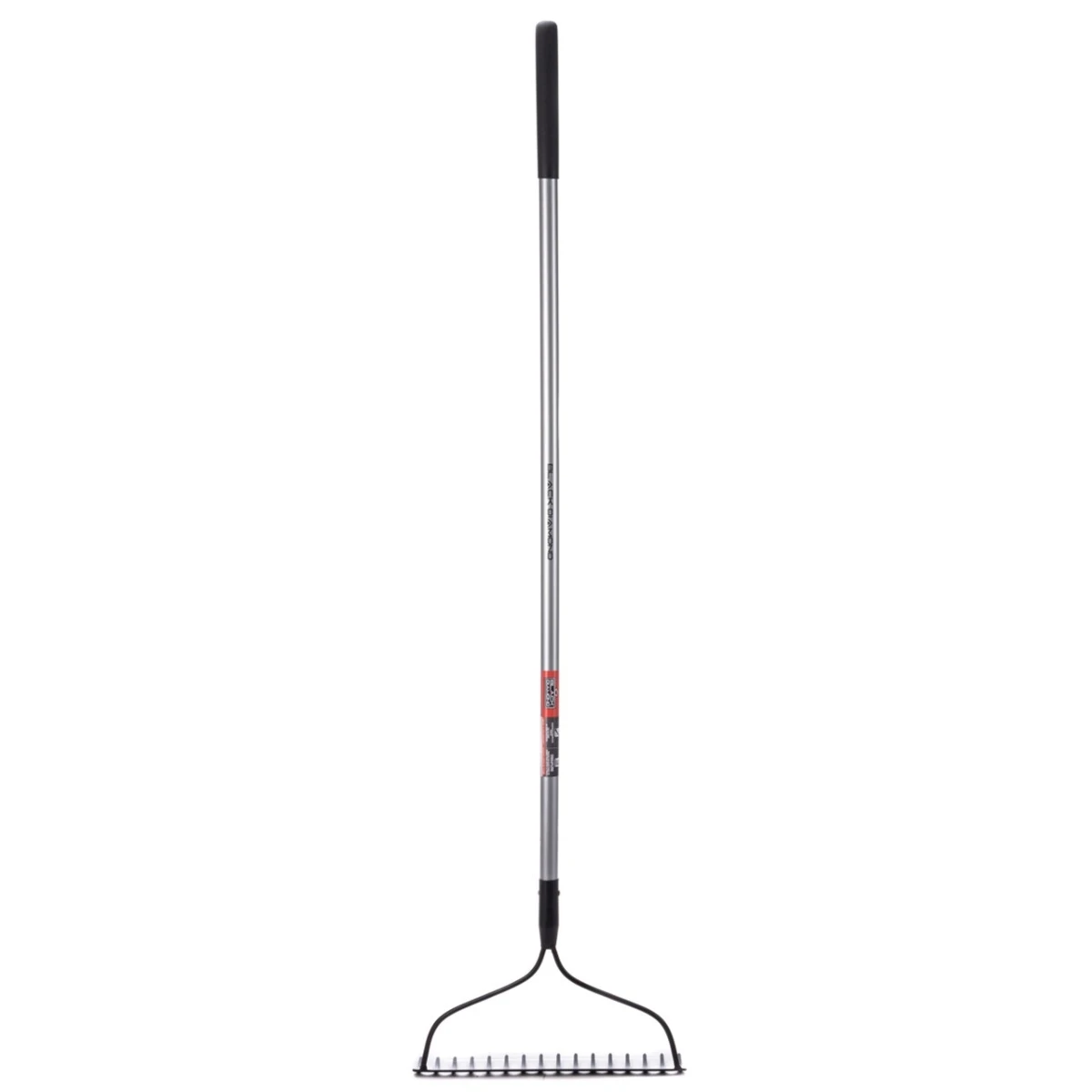 The Black Diamond Welded Bow Rake features a reinforced, fiberglass shaft for increased strength and durability. The rake utilizes 16 steel tines designed to gather large clumps of debris from lawns and the length of the shaft helps gardeners remain upright while working. The tines are specifically made with rust-resistant steel to remove heavier materials such as sand, dirt, gravel, and compacted turf. The Black Diamond Welded Bow Rake is versatile and suitable for a variety of jobs such as leveling soil, spreading mulch, raking leaves and more!