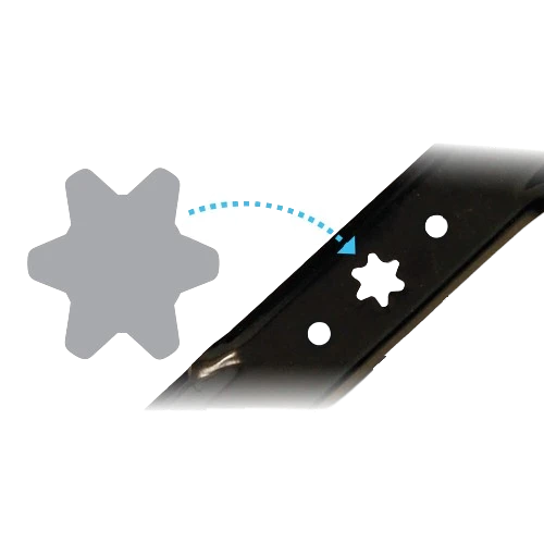 The blade features a 6-POINT STAR center hole pattern and fits 6-POINT STAR spindles only. Check your existing mower blade or spindle pattern first before selecting a blade. You can check to see if your old blade has a part number stamped on it. You can also consult the parts label under the hood of the lawn tractor or under the seat of a zero-turn mower, or refer to the operator’s manual. The deck size of your mower can help to identify the correct blades. Measure to make sure it matches the length of your old blade.  *Blade size is measured diagonally from end to end.  Â