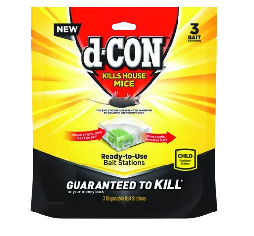 NEW from d-CON! This new formula is made with 99% food grade ingredients. It is so d-LICIOUS that mice will risk their lives for it. The formula does not contain neurotoxins or anti-coagulants. If you have signs of mice (droppings, footprints, gnawing or scampering noises in your walls), you’ll want to try this d-CON Refillable Bait Station. Place the station where you notice signs of mice activity. You’ll be able to see the bait through the station to gauge if mice are eating it or not. Once you notice signs of mice feeding on the baits, mouse activity should cease within a few days. If you don’t see chew marks on the bait after a few days, try moving it to another area. d-CON Disposable Corner Fit Mouse Poison Bait Stations are discreet, compact & this low profile pre-baited station comes ready-to-use. There is no need to touch the bait when placing the station. This bait station is resistant to tampering by children. Mice get the bait, Kids can’t. This should be used indoors only. Ideal for: corners, attics, behind appliances, basements, garages and sheds.