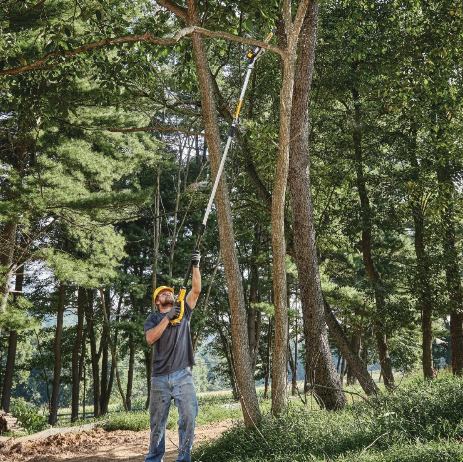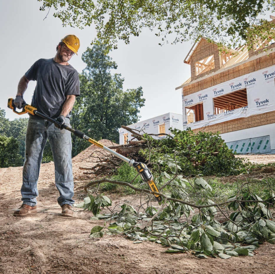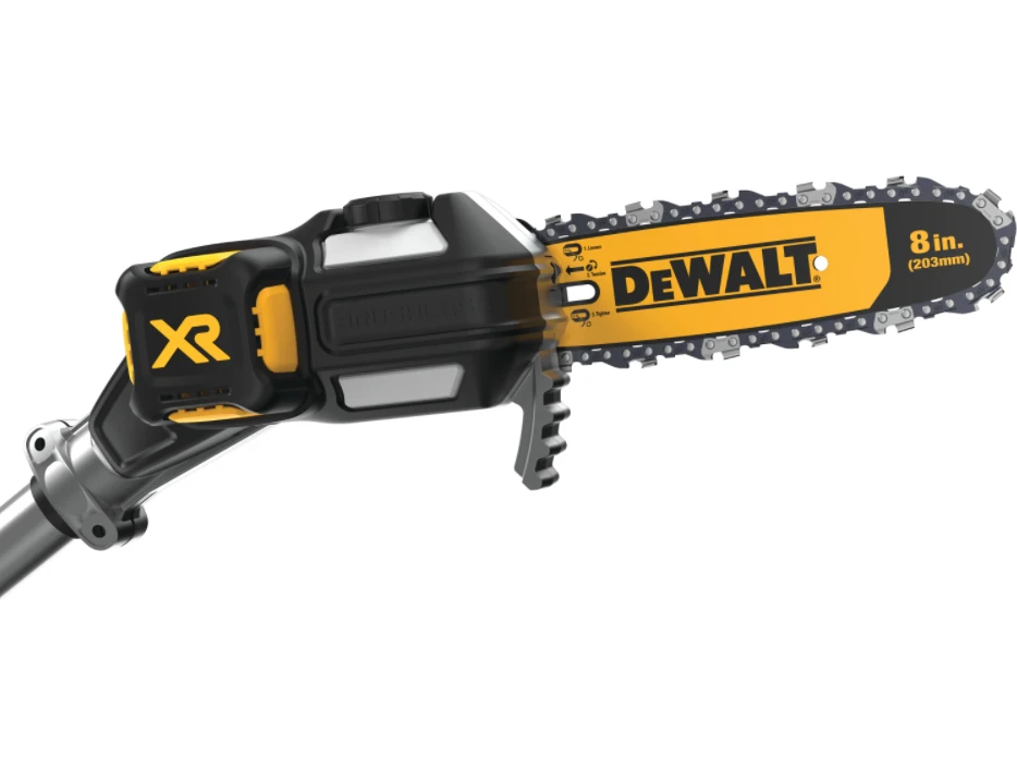 Handle all your pruning needs with the 20V MAX* XR Brushless Cordless Pole Saw. It comes equipped with an 8 in. bar and chain and features a high-efficiency brushless motor. The well-balanced, durable pole shaft extends up to 10 ft. for a total reach of 15 ft. It has an auto oiling feature for added convenience and time savings. It also features metal bucking strips for a durable cutting grip and a tree hook allows you to easily remove pruned branches.