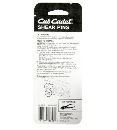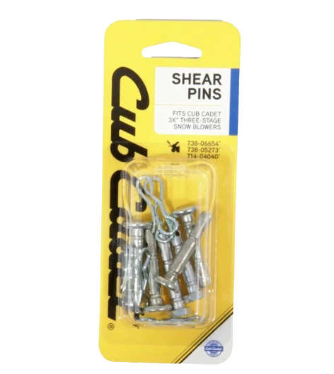 Cub Cadet shear pin kit for 3X snow blowers. Fits all Cub Cadet three-stage snow blowers. Protects the snow blower’s auger gearbox from potential damage if ice or debris becomes lodged in the machine’s housing.