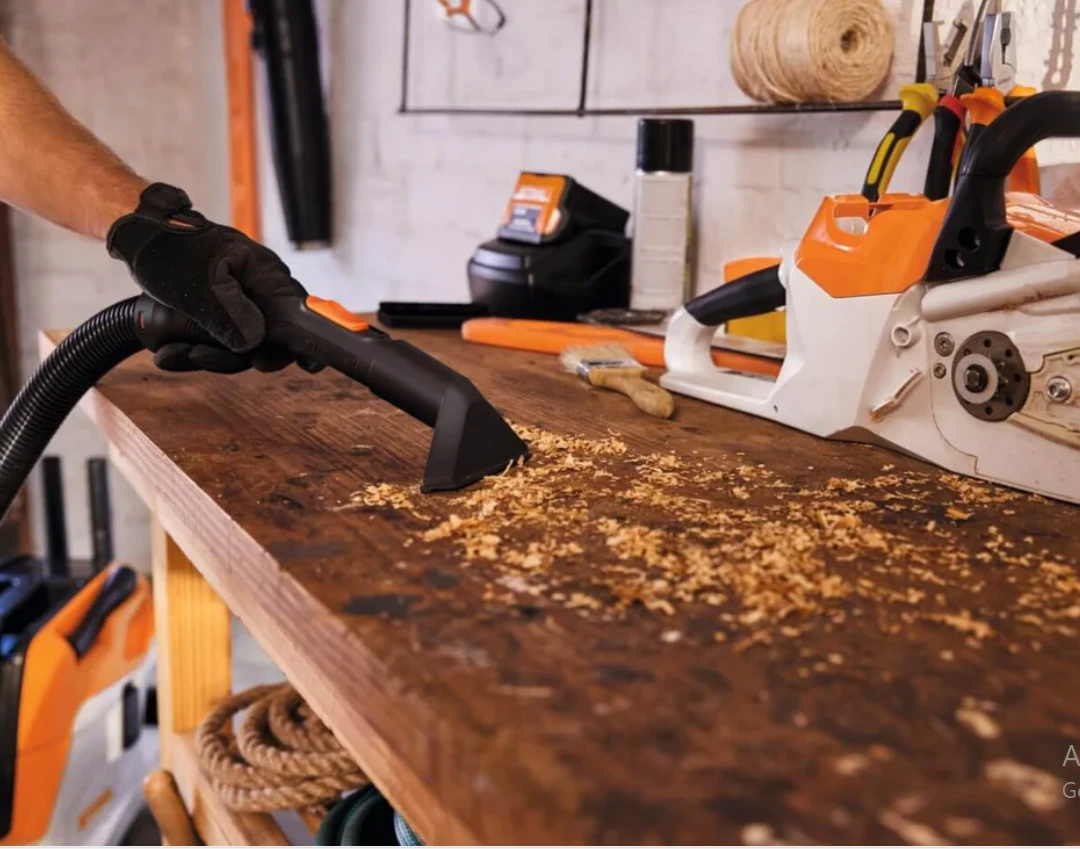 A range of accessories are included in the scope of delivery, such as a universal floor and crevice nozzle for different cleaning tasks. A 2.2m long, rotatable suction hose and a 2-piece suction tube are also included for hard-to-reach areas. Plus, there is a power tool adapter for use with a jigsaw or sander, a PET filter cartridge and a filter bag. All the accessories can be stored on the tool for added convenience when working or storing the machine away.