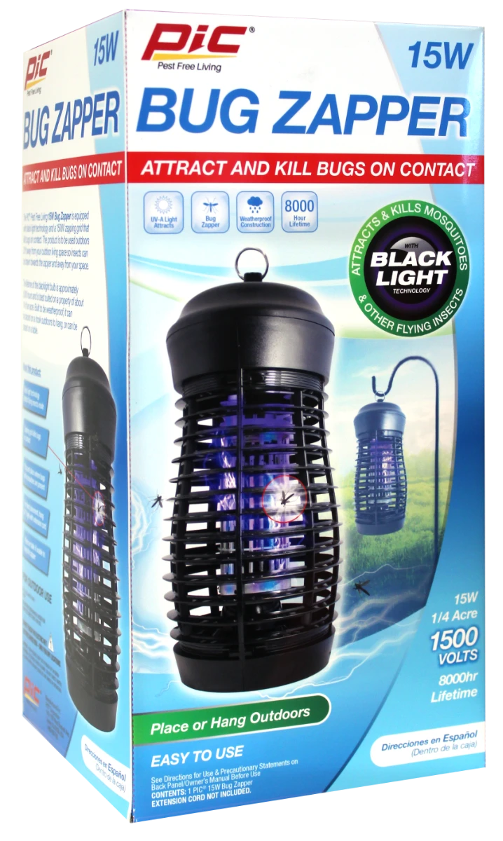 PIC Mosquito & Flying Insect Bug Zapper packs a 15 Watt punch to kill bugs on contact. With black light technology, the bug zapper not only kills bugs on contact but attracts them to the light. Place or hang the bug zapper outdoors. Its weatherproof design will hold up to the elements.Kills Bugs on Contact Blacklight Attracts Place or Hang Outdoors