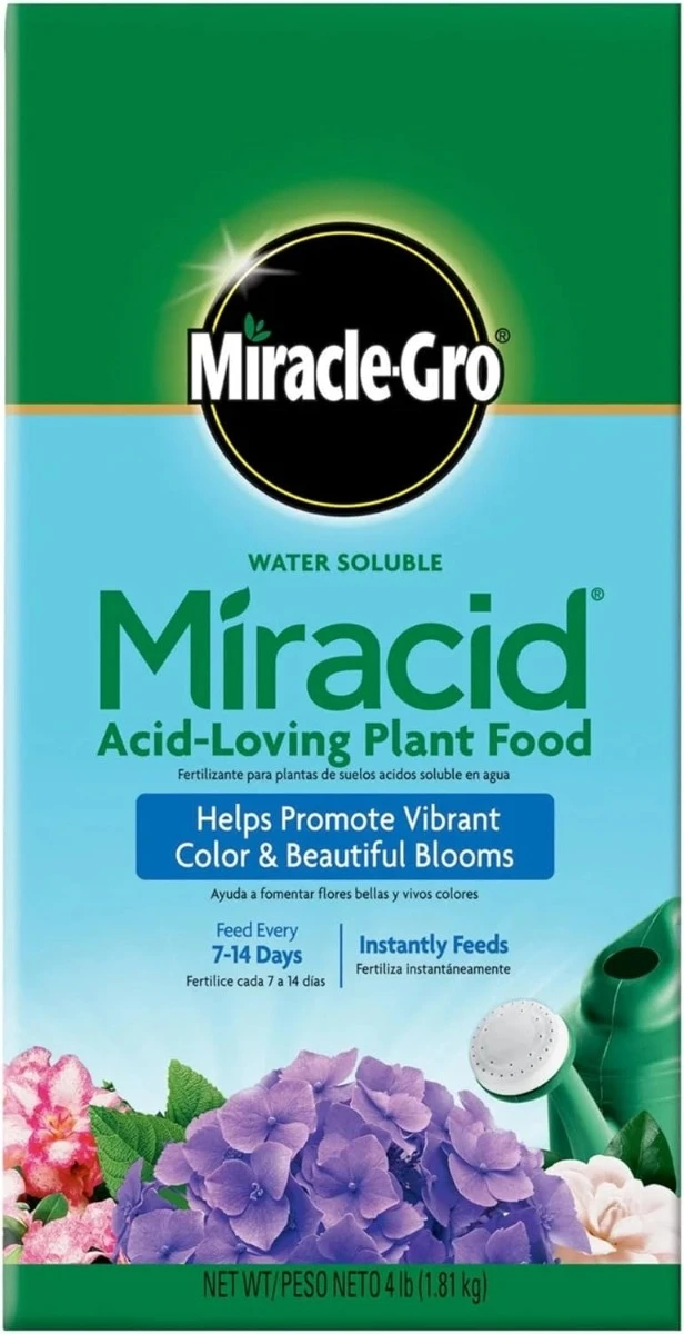 Help your acid loving plants thrive with Miracle-Gro® Water Soluble Miracid® Acid-Loving Plant Food. This water soluble fertilizer helps promote vibrant color and beautiful blooms. It feeds instantly, and is great for use on acid-loving plants, including azalea, camellia, gardenia, hibiscus, holly, hydrangea, and orchid.Â