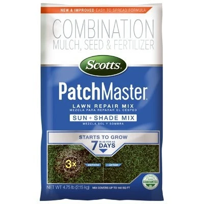Scotts PatchMaster Lawn Repair Mix Sun & Shade Mix 4.75 LB New Formula/Absorbs 3X Water/Guaranteed to see growth in as few as 7 days/Soil-colored recyclable mulch/No more mess or manual breakdown/Improved experience/Better seeding success/100% satisfaction guaranteed