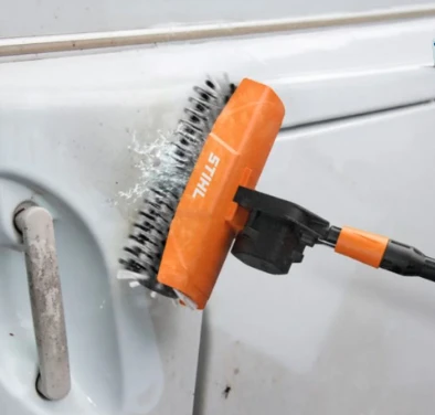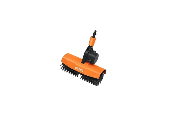 The STIHL rotating brush roller attaches easily to a STIHL high-pressure washer with a bayonet lock and allows for a soft cleaning of more sensitive outdoor surfaces, such as wooden or stone patios, facades, or garage doors. Soft brushes are available as special accessories for cleaning surfaces such as windows, solar systems, roller shutters, or painted or plastic surfaces. A splash guard protects both the user and the surroundings from splashing water, and a quick-release fastener means quick and easy replacement of the brush bristles.
