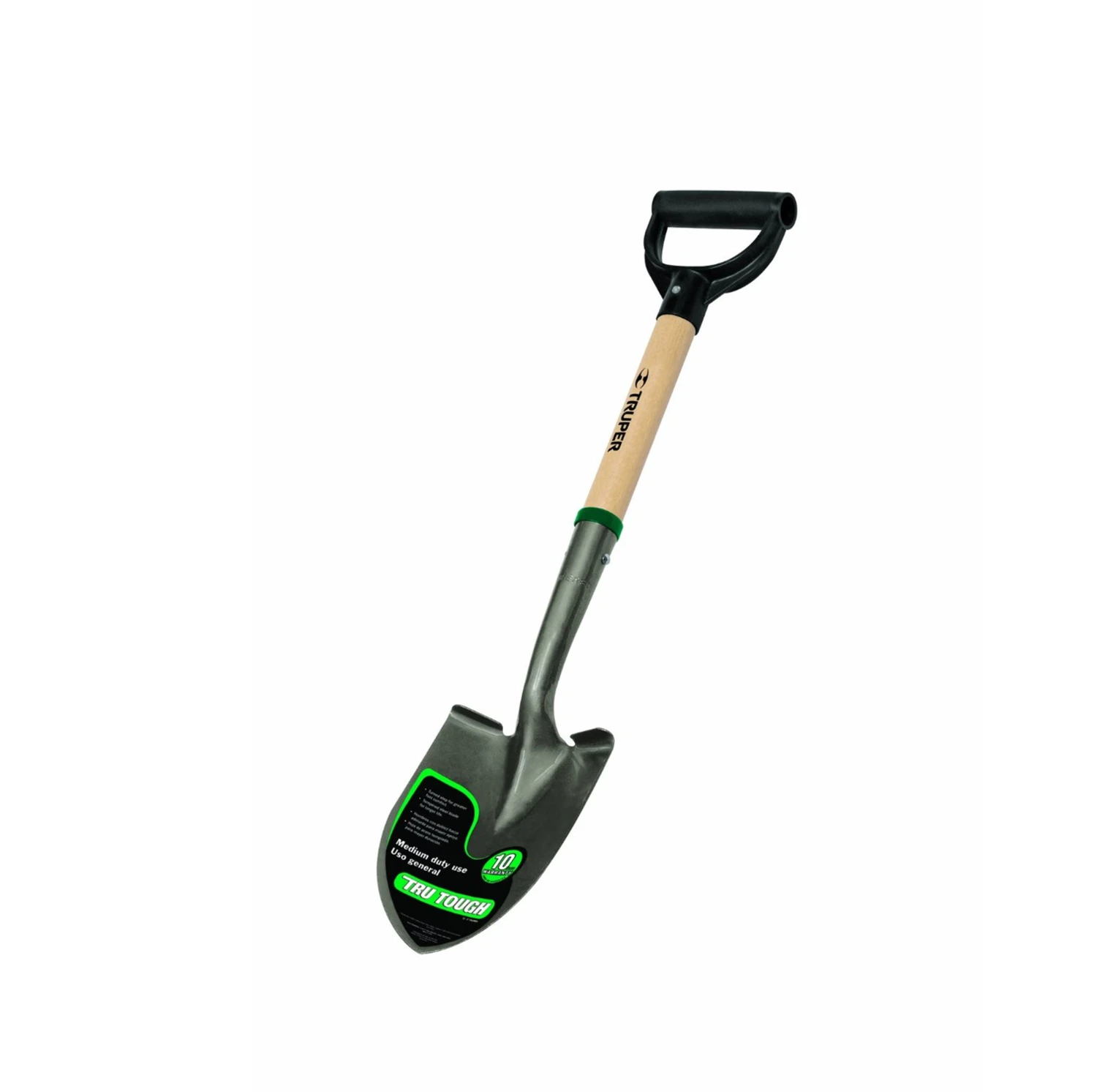 Tru Tough Short D-Handle Round Point Shovel. 19-inch North American Ash, lacquered handle for strength and durability. White Ash handles give optimum ratio of resistance and flexibility. 9-inch Cushion grip for improved control and reduced hand fatigue. Sturdy steel collar reinforces head to handle assembly. A seriously long lasting tool at an affordable price